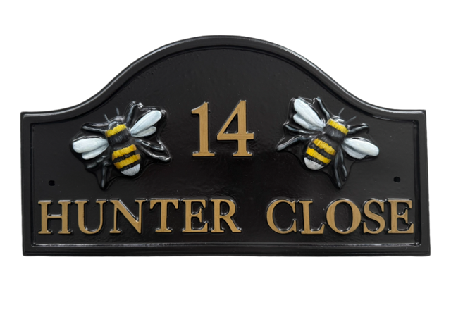 Our Split Bee design offers a clean, classic composition centred around two beautifully detailed raised honeybees, positioned symmetrically to create a balanced and elegant finish. Each bee is cast into the sign and individually hand-painted by our artists, allowing for subtle shading, texture, and depth that brings the design to life.